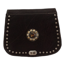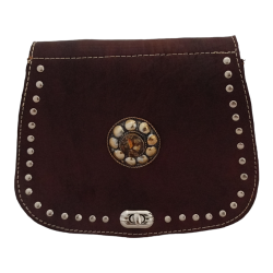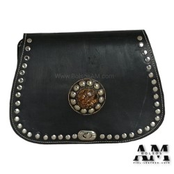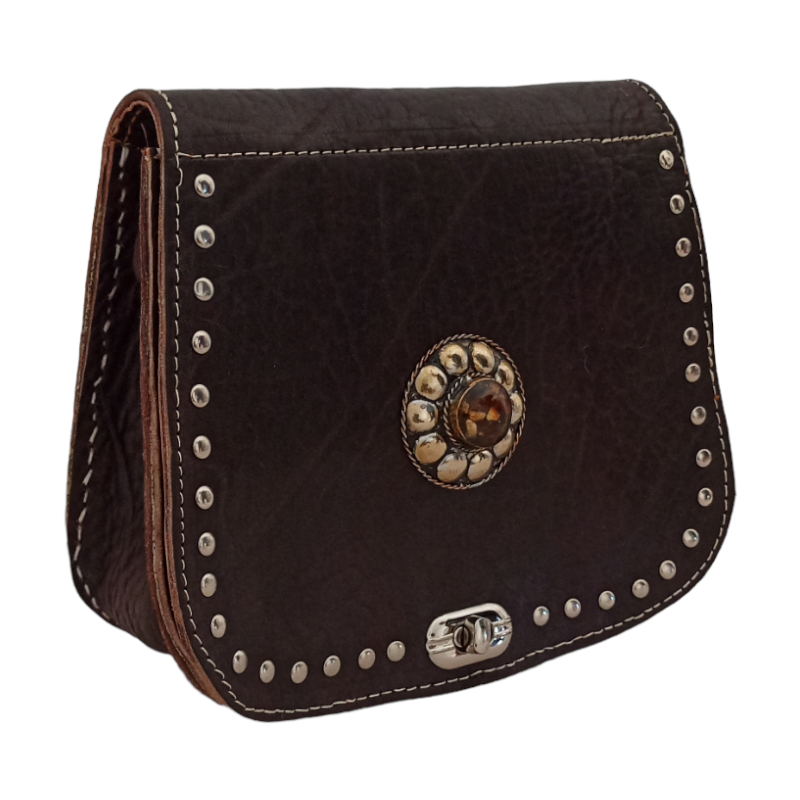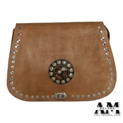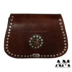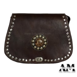 Bolso de cuero engrasado con detalles de piedra y tachuelas disponible en dos tamaños y colores; Marrón, Cuero, Negoro.